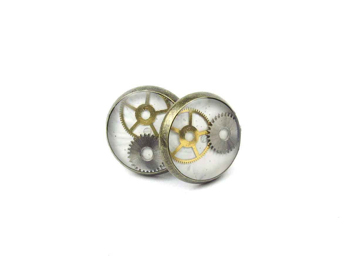 Cercei Steampunk realizati manual din piese de ceas prinse in rasina. Cu sufletul la gura si cu lupa la-ndemana, am ales rotita cu rotita si ne-am straduit sa facem cerceii sa semene cat mai mult unul cu celalalt, doi cate doi, asa cum le sta cel mai bine 🙂