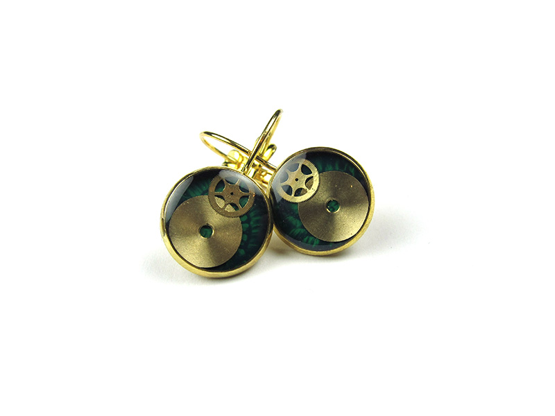 Cercei Steampunk realizati manual de catre noi in atelierul LaCercei.ro din rotite de ceas, doua cate doua, cum le sta lor cel mai bine. Aceasta pereche de cercei poate fi cadoul perfect pentru un amator de Steampunk. Dimensiunile sunt specificate in dreapta fotografiei de mai sus si te rugam insistent sa citesti toata descrierea acestui produs. Fotografiile redau realitatea insa pot exista diferente de culoare datorita setarilor monitorului tau. Fiecare bijuterie este unicat si data fiind natura elementelor folosite nu-i vom putea reface intocmai. Materialele utilizate sunt: baze metalice, vopsea acrilica, piese de ceas si rasina epoxidica. Bijuteriile trebuie pastrate in locuri ferite de lumina directa a soarelui si de umezeala. Deasemenea trebuie ferite de acizi sau solutii pe baza de acetone si alcooli. Suprafata rasinii se curata cu o carpa moale si uscata.