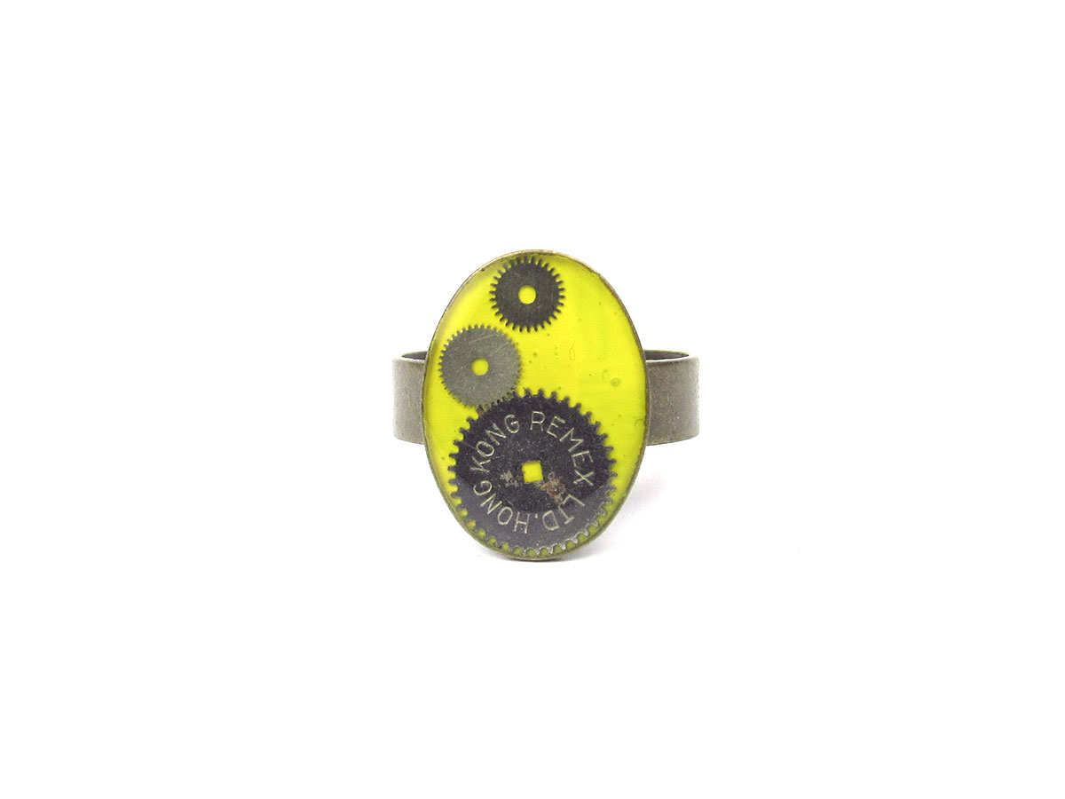 Inel Steampunk realizat manual din piese de ceas prinse cu grija in rasina. Toate piesele ce pot fi regasite inauntru provin din ceasuri adevarate, demontate chiar de catre noi!