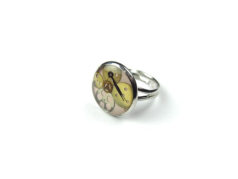 Inel Steampunk realizat manual in atelierul LaCercei.ro utilizand piese din ceasuri mecanice incastrate in rasina. Acest Inel poate fi cadoul perfect pentru un amator de Steampunk. Dimensiunile sunt specificate in dreapta fotografiei de mai sus si te rugam insistent sa citesti toata descrierea acestui produs. Fotografiile redau realitatea insa pot exista diferente de culoare datorita setarilor monitorului tau. Fiecare bijuterie este unicat si data fiind natura elementelor folosite nu-l vom putea reface intocmai. Materialele utilizate sunt: baza metalica, vopsea acrilica, piese de ceas si rasina epoxidica. Bijuteriile trebuie pastrate in locuri ferite de lumina directa a soarelui si de umezeala. Deasemenea trebuie ferite de acizi sau solutii pe baza de acetone si alcooli. Suprafata rasinii se curata cu o carpa moale si uscata.