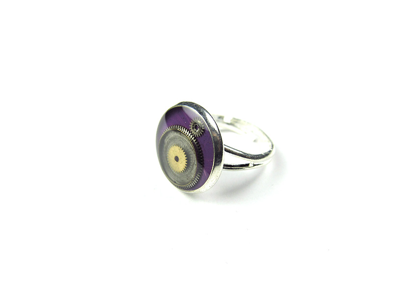Inel Steampunk realizat manual in atelierul LaCercei.ro utilizand piese din ceasuri mecanice incastrate in rasina. Acest Inel poate fi cadoul perfect pentru un amator de Steampunk. Dimensiunile sunt specificate in dreapta fotografiei de mai sus si te rugam insistent sa citesti toata descrierea acestui produs. Fotografiile redau realitatea insa pot exista diferente de culoare datorita setarilor monitorului tau. Fiecare bijuterie este unicat si data fiind natura elementelor folosite nu-l vom putea reface intocmai. Materialele utilizate sunt: baza metalica, vopsea acrilica, piese de ceas si rasina epoxidica. Bijuteriile trebuie pastrate in locuri ferite de lumina directa a soarelui si de umezeala. Deasemenea trebuie ferite de acizi sau solutii pe baza de acetone si alcooli. Suprafata rasinii se curata cu o carpa moale si uscata.