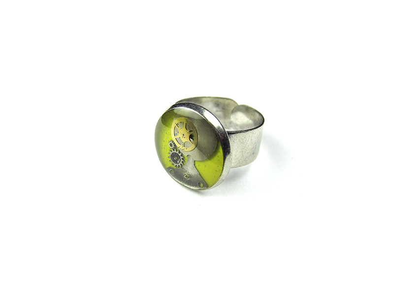 Inel Steampunk realizat manual in atelierul LaCercei.ro utilizand piese din ceasuri mecanice incastrate in rasina. Acest Inel poate fi cadoul perfect pentru un amator de Steampunk. Dimensiunile sunt specificate in dreapta fotografiei de mai sus si te rugam insistent sa citesti toata descrierea acestui produs. Fotografiile redau realitatea insa pot exista diferente de culoare datorita setarilor monitorului tau. Fiecare bijuterie este unicat si data fiind natura elementelor folosite nu-l vom putea reface intocmai. Materialele utilizate sunt: baza metalica, vopsea acrilica, piese de ceas si rasina epoxidica. Bijuteriile trebuie pastrate in locuri ferite de lumina directa a soarelui si de umezeala. Deasemenea trebuie ferite de acizi sau solutii pe baza de acetone si alcooli. Suprafata rasinii se curata cu o carpa moale si uscata.