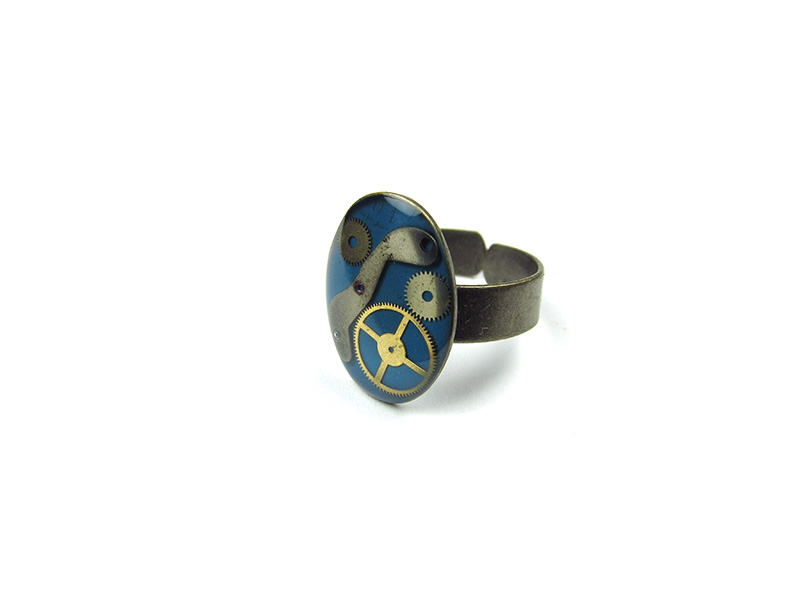 Inel Steampunk realizat manual in atelierul LaCercei.ro utilizand piese din ceasuri mecanice incastrate in rasina. Acest Inel poate fi cadoul perfect pentru un amator de Steampunk. Dimensiunile sunt specificate in dreapta fotografiei de mai sus si te rugam insistent sa citesti toata descrierea acestui produs. Fotografiile redau realitatea insa pot exista diferente de culoare datorita setarilor monitorului tau. Fiecare bijuterie este unicat si data fiind natura elementelor folosite nu-l vom putea reface intocmai. Materialele utilizate sunt: baza metalica, vopsea acrilica, piese de ceas si rasina epoxidica. Bijuteriile trebuie pastrate in locuri ferite de lumina directa a soarelui si de umezeala. Deasemenea trebuie ferite de acizi sau solutii pe baza de acetone si alcooli. Suprafata rasinii se curata cu o carpa moale si uscata.