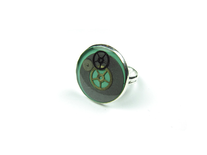 Inel Steampunk realizat manual in atelierul LaCercei.ro utilizand piese din ceasuri mecanice incastrate in rasina. Acest Inel poate fi cadoul perfect pentru un amator de Steampunk. Dimensiunile sunt specificate in dreapta fotografiei de mai sus si te rugam insistent sa citesti toata descrierea acestui produs. Fotografiile redau realitatea insa pot exista diferente de culoare datorita setarilor monitorului tau. Fiecare bijuterie este unicat si data fiind natura elementelor folosite nu-l vom putea reface intocmai. Materialele utilizate sunt: baza metalica, vopsea acrilica, piese de ceas si rasina epoxidica. Bijuteriile trebuie pastrate in locuri ferite de lumina directa a soarelui si de umezeala. Deasemenea trebuie ferite de acizi sau solutii pe baza de acetone si alcooli. Suprafata rasinii se curata cu o carpa moale si uscata.