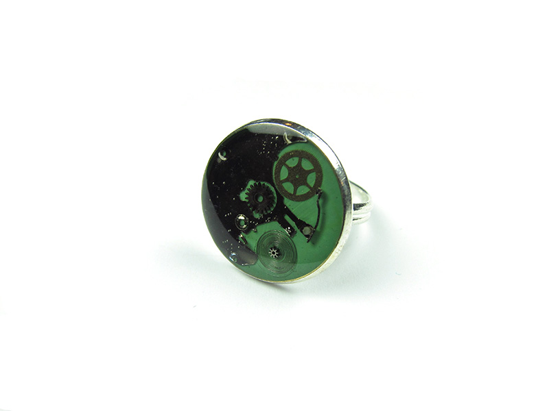 Inel Steampunk realizat manual in atelierul LaCercei.ro utilizand piese din ceasuri mecanice incastrate in rasina. Acest Inel poate fi cadoul perfect pentru un amator de Steampunk. Dimensiunile sunt specificate in dreapta fotografiei de mai sus si te rugam insistent sa citesti toata descrierea acestui produs. Fotografiile redau realitatea insa pot exista diferente de culoare datorita setarilor monitorului tau. Fiecare bijuterie este unicat si data fiind natura elementelor folosite nu-l vom putea reface intocmai. Materialele utilizate sunt: baza metalica, vopsea acrilica, piese de ceas si rasina epoxidica. Bijuteriile trebuie pastrate in locuri ferite de lumina directa a soarelui si de umezeala. Deasemenea trebuie ferite de acizi sau solutii pe baza de acetone si alcooli. Suprafata rasinii se curata cu o carpa moale si uscata.