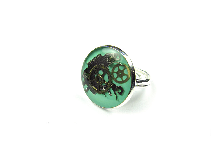 Inel Steampunk realizat manual in atelierul LaCercei.ro utilizand piese din ceasuri mecanice incastrate in rasina. Acest Inel poate fi cadoul perfect pentru un amator de Steampunk. Dimensiunile sunt specificate in dreapta fotografiei de mai sus si te rugam insistent sa citesti toata descrierea acestui produs. Fotografiile redau realitatea insa pot exista diferente de culoare datorita setarilor monitorului tau. Fiecare bijuterie este unicat si data fiind natura elementelor folosite nu-l vom putea reface intocmai. Materialele utilizate sunt: baza metalica, vopsea acrilica, piese de ceas si rasina epoxidica. Bijuteriile trebuie pastrate in locuri ferite de lumina directa a soarelui si de umezeala. Deasemenea trebuie ferite de acizi sau solutii pe baza de acetone si alcooli. Suprafata rasinii se curata cu o carpa moale si uscata.