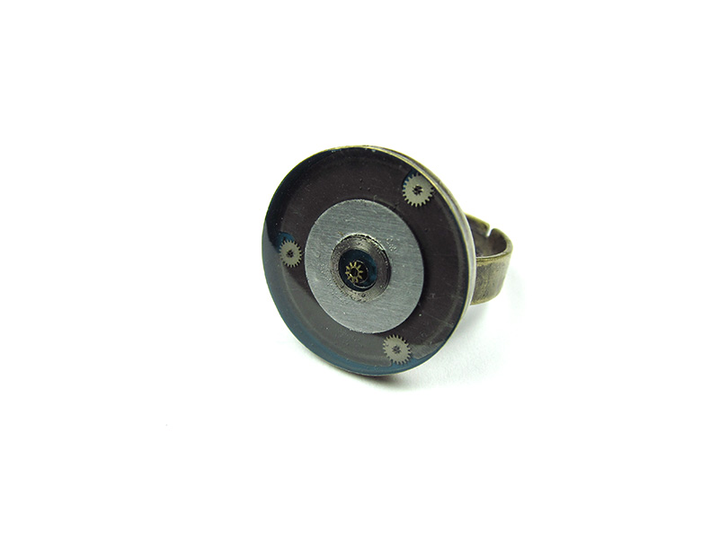 Inel Steampunk realizat manual in atelierul LaCercei.ro utilizand piese din ceasuri mecanice incastrate in rasina. Acest Inel poate fi cadoul perfect pentru un amator de Steampunk. Dimensiunile sunt specificate in dreapta fotografiei de mai sus si te rugam insistent sa citesti toata descrierea acestui produs. Fotografiile redau realitatea insa pot exista diferente de culoare datorita setarilor monitorului tau. Fiecare bijuterie este unicat si data fiind natura elementelor folosite nu-l vom putea reface intocmai. Materialele utilizate sunt: baza metalica, vopsea acrilica, piese de ceas si rasina epoxidica. Bijuteriile trebuie pastrate in locuri ferite de lumina directa a soarelui si de umezeala. Deasemenea trebuie ferite de acizi sau solutii pe baza de acetone si alcooli. Suprafata rasinii se curata cu o carpa moale si uscata.