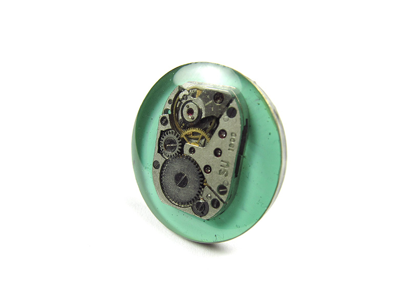Inel Steampunk realizat manual in atelierul LaCercei.ro utilizand piese din ceasuri mecanice incastrate in rasina. Acest Inel poate fi cadoul perfect pentru un amator de Steampunk. Dimensiunile sunt specificate in dreapta fotografiei de mai sus si te rugam insistent sa citesti toata descrierea acestui produs. Fotografiile redau realitatea insa pot exista diferente de culoare datorita setarilor monitorului tau. Fiecare bijuterie este unicat si data fiind natura elementelor folosite nu-l vom putea reface intocmai. Materialele utilizate sunt: baza metalica, vopsea acrilica, piese de ceas si rasina epoxidica. Bijuteriile trebuie pastrate in locuri ferite de lumina directa a soarelui si de umezeala. Deasemenea trebuie ferite de acizi sau solutii pe baza de acetone si alcooli. Suprafata rasinii se curata cu o carpa moale si uscata.