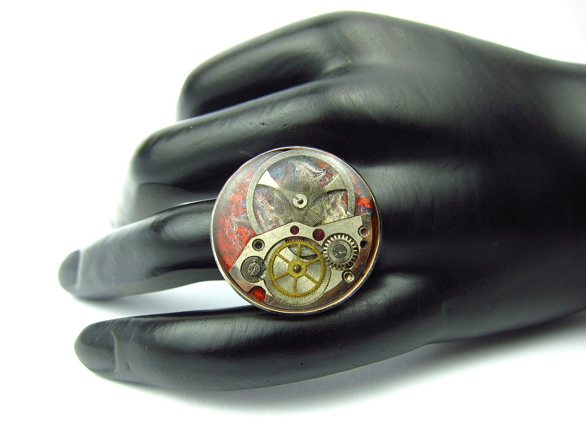 Inel Steampunk realizat manual in atelierul LaCercei.ro utilizand piese din ceasuri mecanice si/sau diverse ornamente metalice incastrate in rasina. Materialele utilizate sunt: baze metalice, vopsea acrilica, piese de ceas si rasina epoxidica.