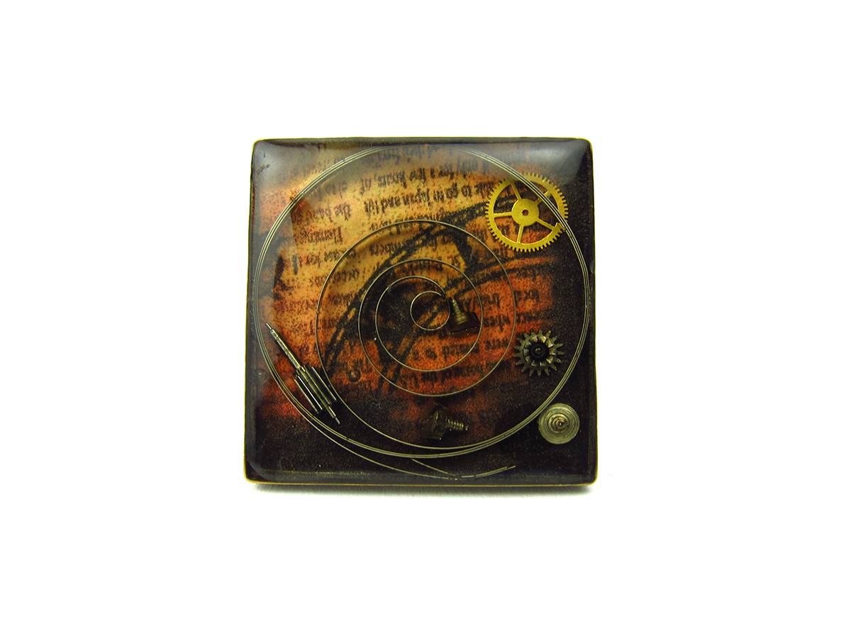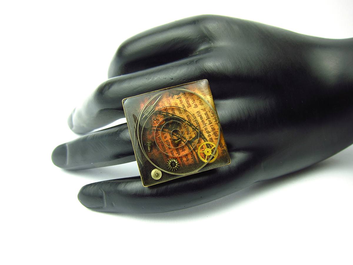 Inel Steampunk realizat manual in atelierul LaCercei.ro utilizand piese din ceasuri mecanice si/sau diverse ornamente metalice incastrate in rasina. Materialele utilizate sunt: baze metalice, vopsea acrilica, piese de ceas si rasina epoxidica.