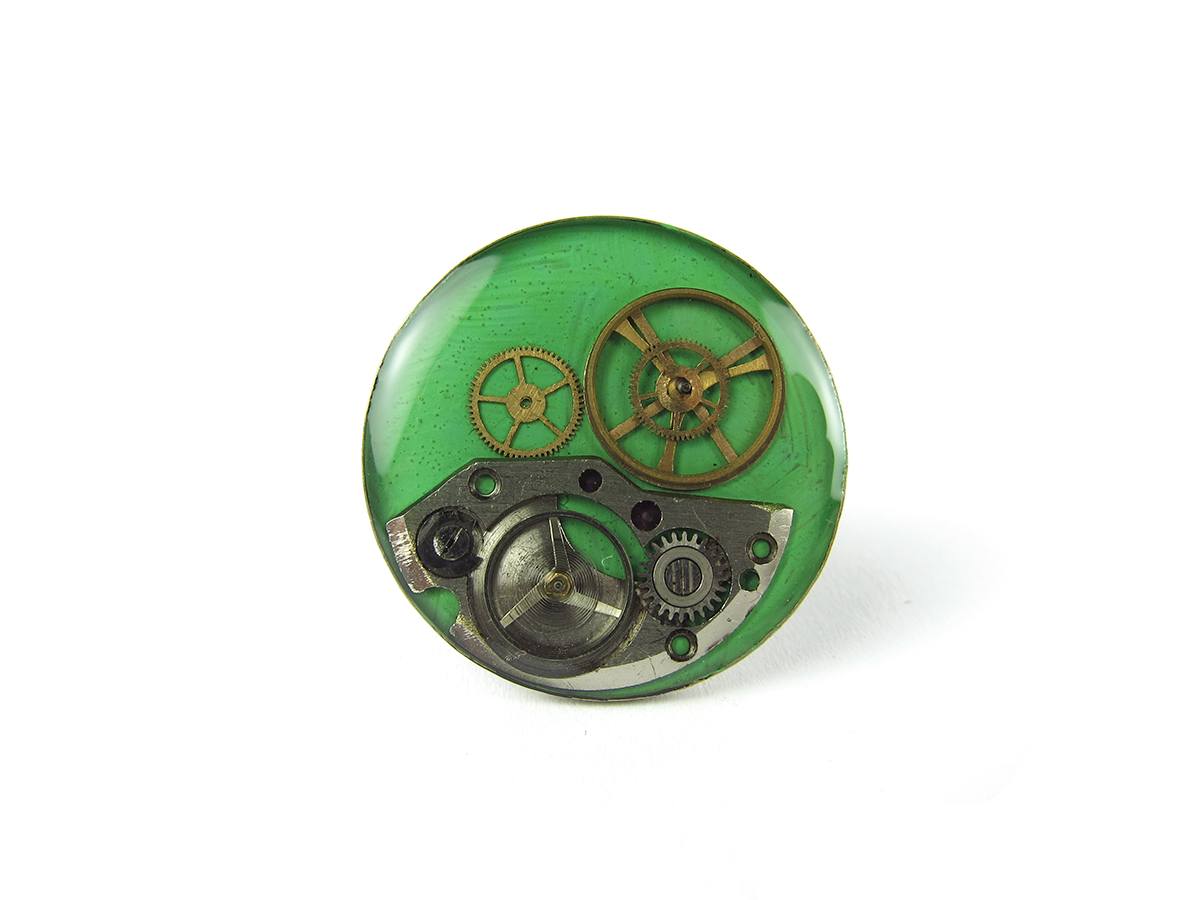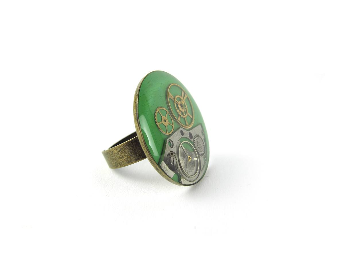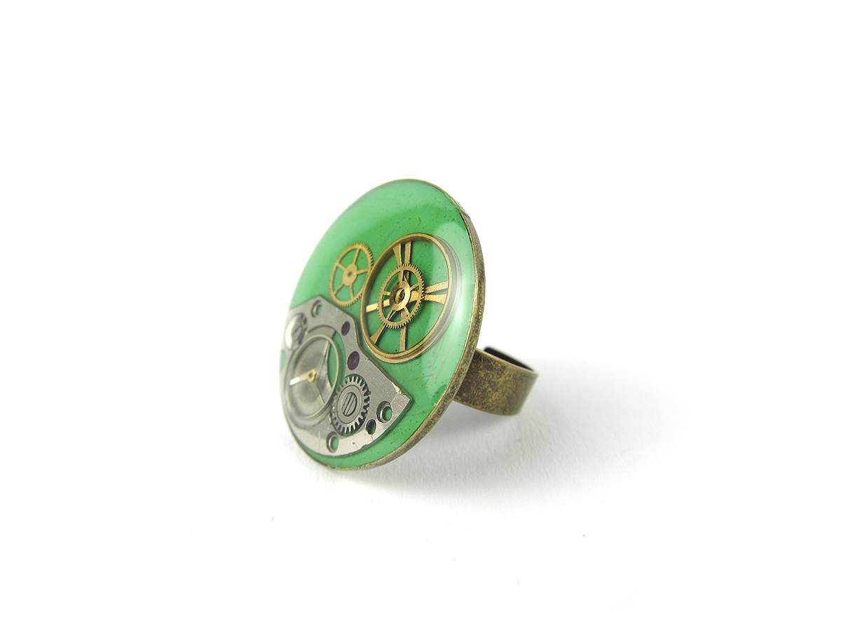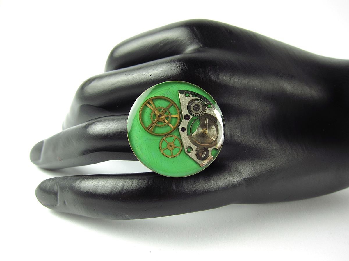 Inel Steampunk realizat manual in atelierul LaCercei.ro utilizand piese din ceasuri mecanice si/sau diverse ornamente metalice incastrate in rasina. Materialele utilizate sunt: baze metalice, vopsea acrilica, piese de ceas si rasina epoxidica.