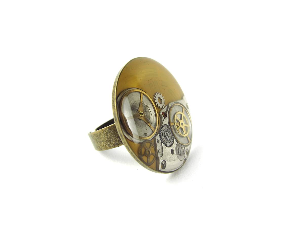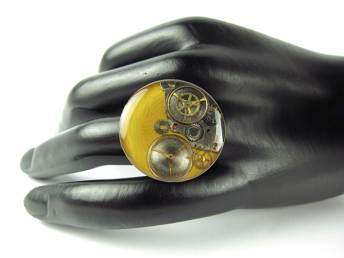 Inel Steampunk realizat manual in atelierul LaCercei.ro utilizand piese din ceasuri mecanice si/sau diverse ornamente metalice incastrate in rasina. Materialele utilizate sunt: baze metalice, vopsea acrilica, piese de ceas si rasina epoxidica.