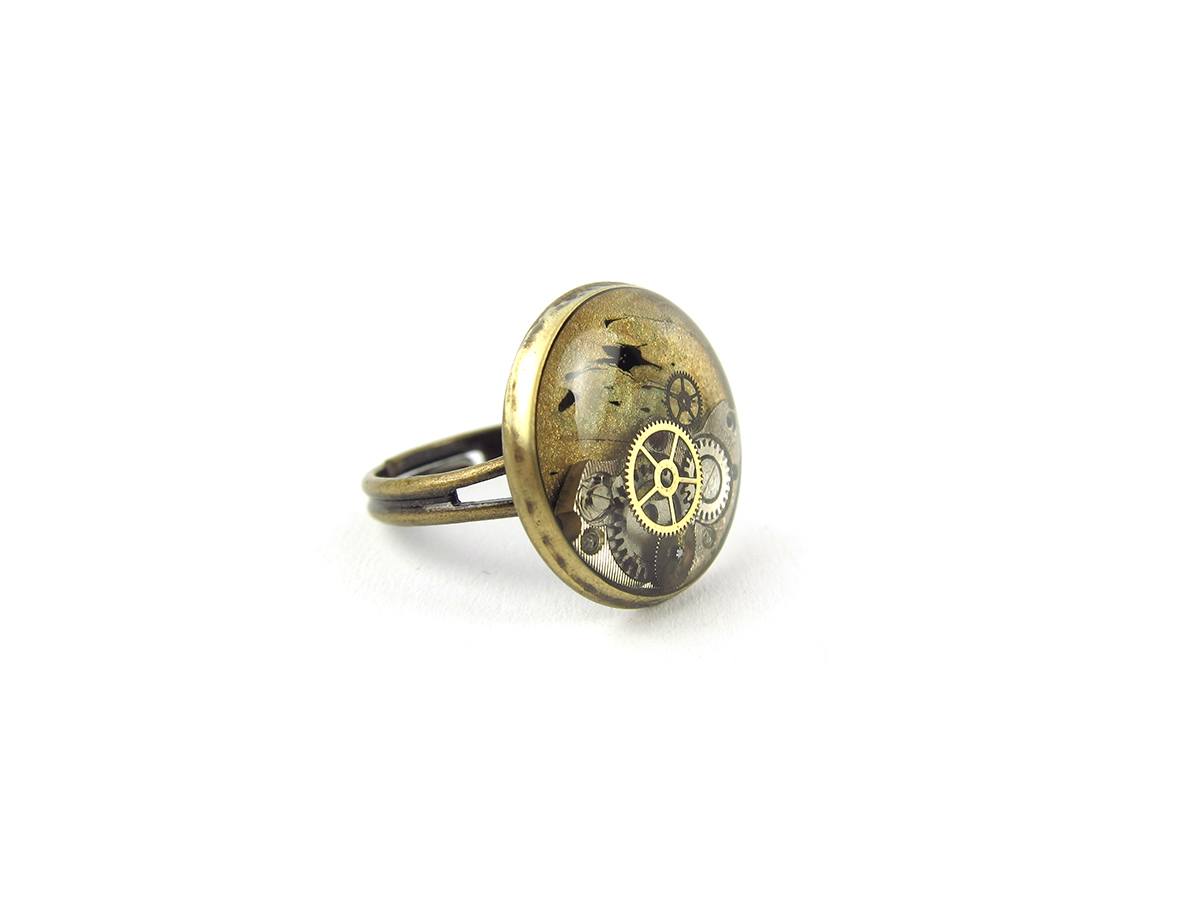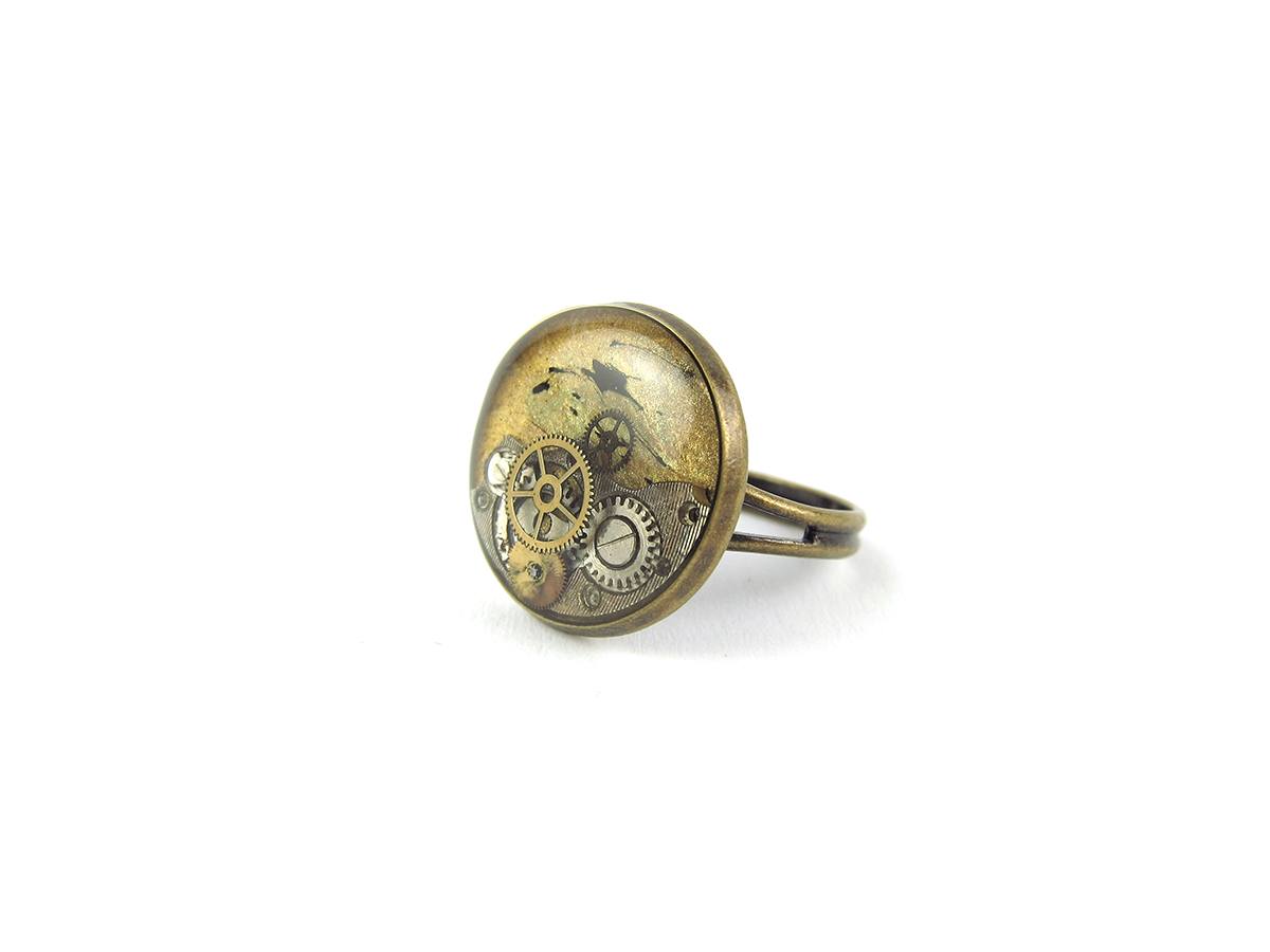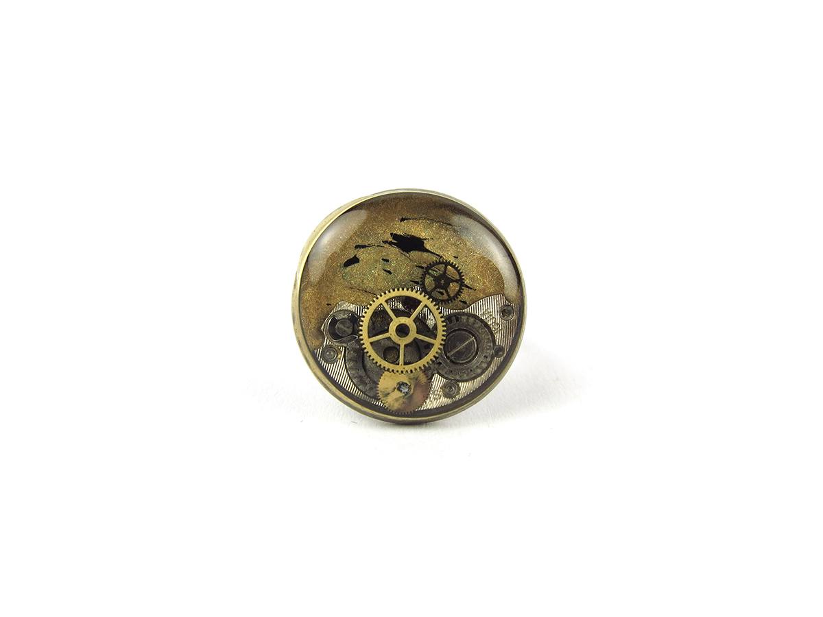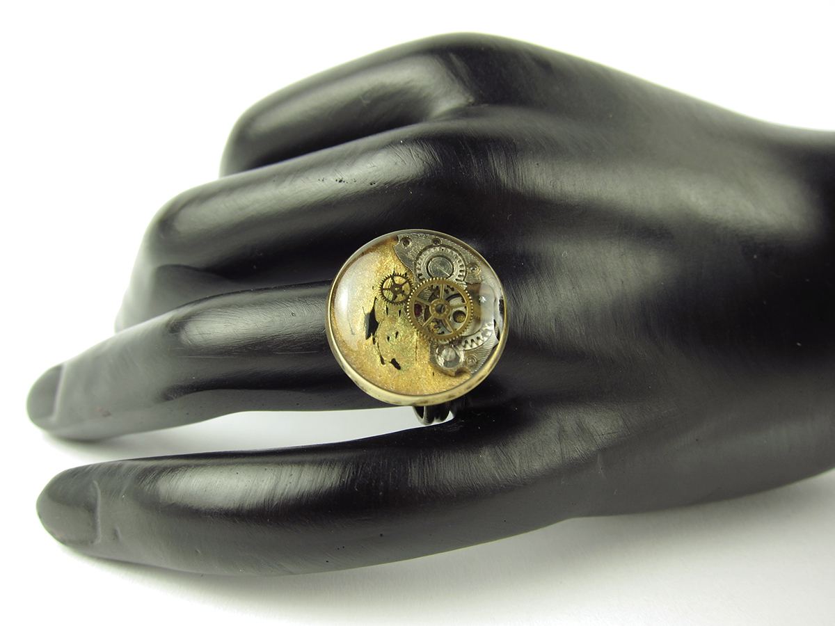 Inel Steampunk realizat manual in atelierul LaCercei.ro utilizand piese din ceasuri mecanice si/sau diverse ornamente metalice incastrate in rasina. Materialele utilizate sunt: baze metalice, vopsea acrilica, piese de ceas si rasina epoxidica.