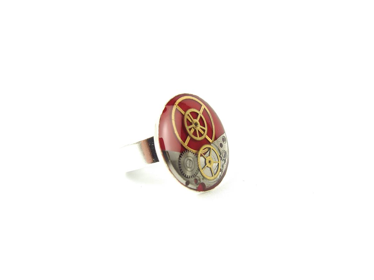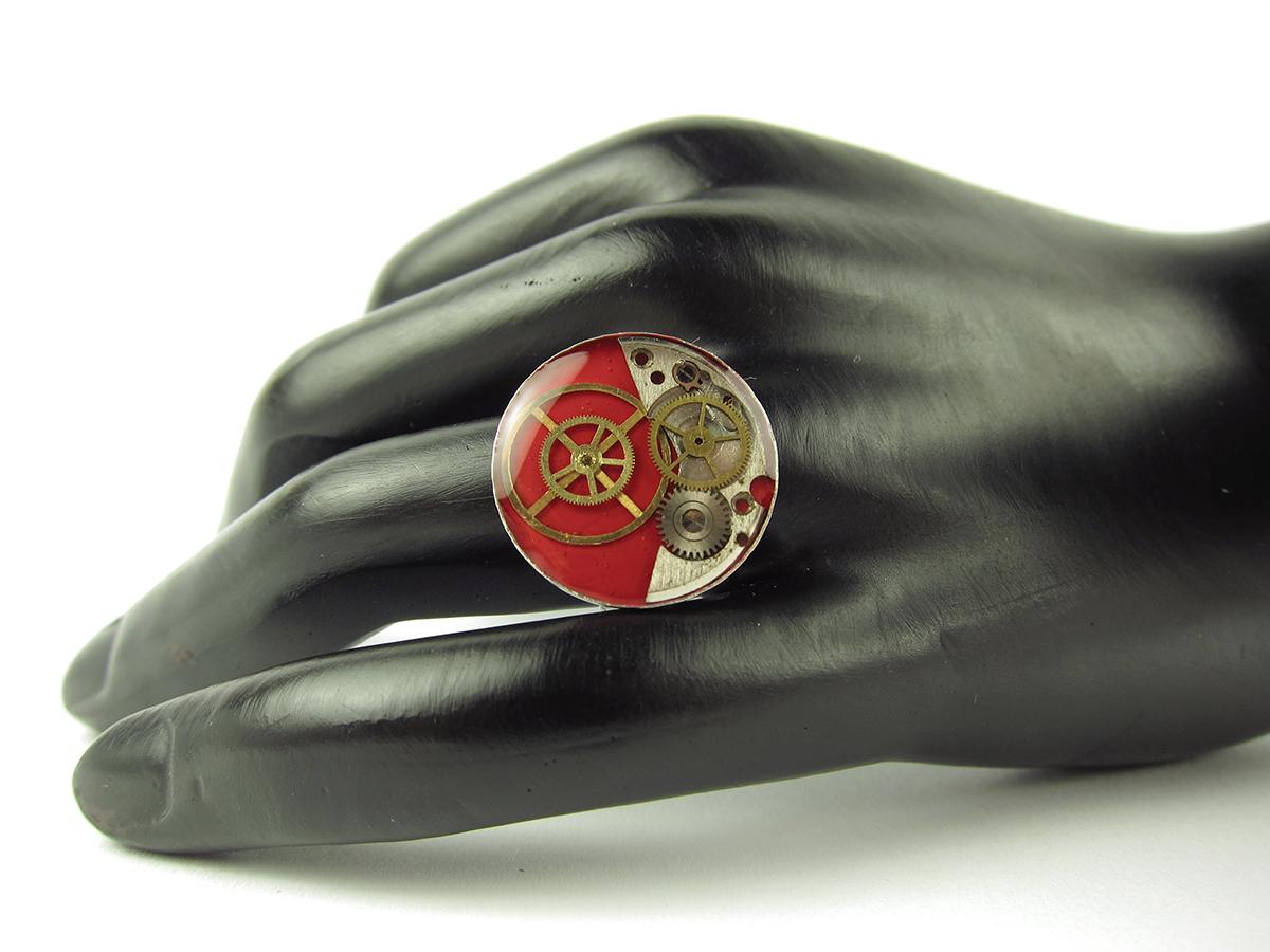 Inel Steampunk realizat manual in atelierul LaCercei.ro utilizand piese din ceasuri mecanice si/sau diverse ornamente metalice incastrate in rasina. Materialele utilizate sunt: baze metalice, vopsea acrilica, piese de ceas si rasina epoxidica.