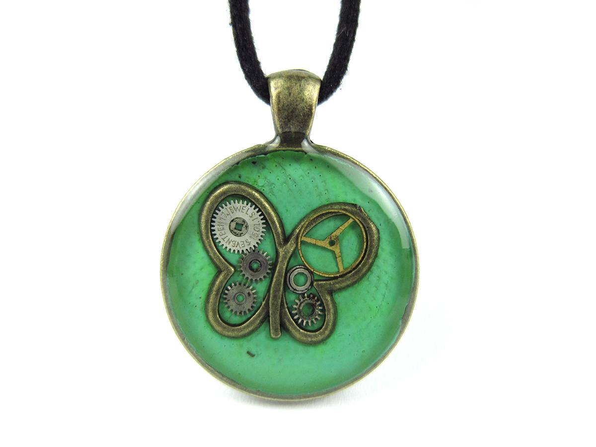 Pandantiv/ colier Steampunk realizat manual in atelierul LaCercei.ro utilizand piese din ceasuri mecanice incastrate in rasina. Materialele utilizate sunt: baza metalica, vopsea acrilica, piese de ceas si rasina epoxidica.