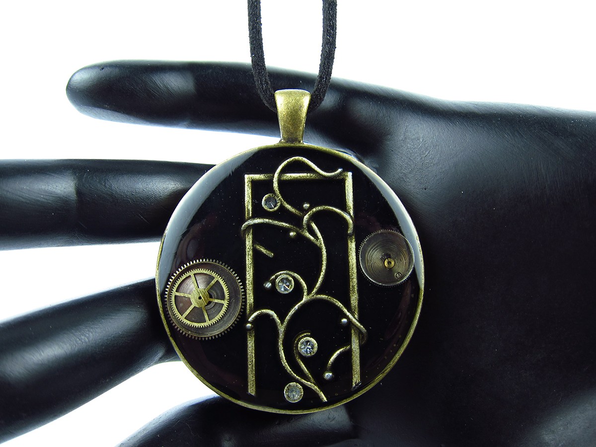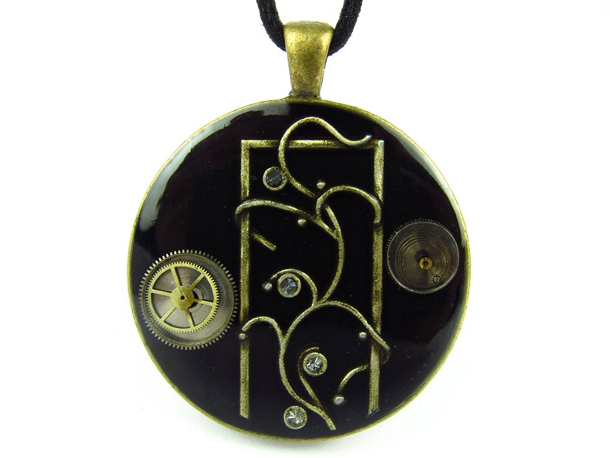 Pandantiv/ colier Steampunk realizat manual in atelierul LaCercei.ro utilizand piese din ceasuri mecanice incastrate in rasina. Materialele utilizate sunt: baza metalica, vopsea acrilica, piese de ceas si rasina epoxidica.