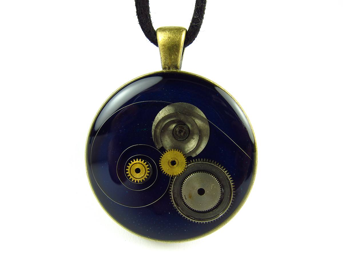 Pandantiv/ colier Steampunk realizat manual in atelierul LaCercei.ro utilizand piese din ceasuri mecanice incastrate in rasina. Materialele utilizate sunt: baza metalica, vopsea acrilica, piese de ceas si rasina epoxidica.