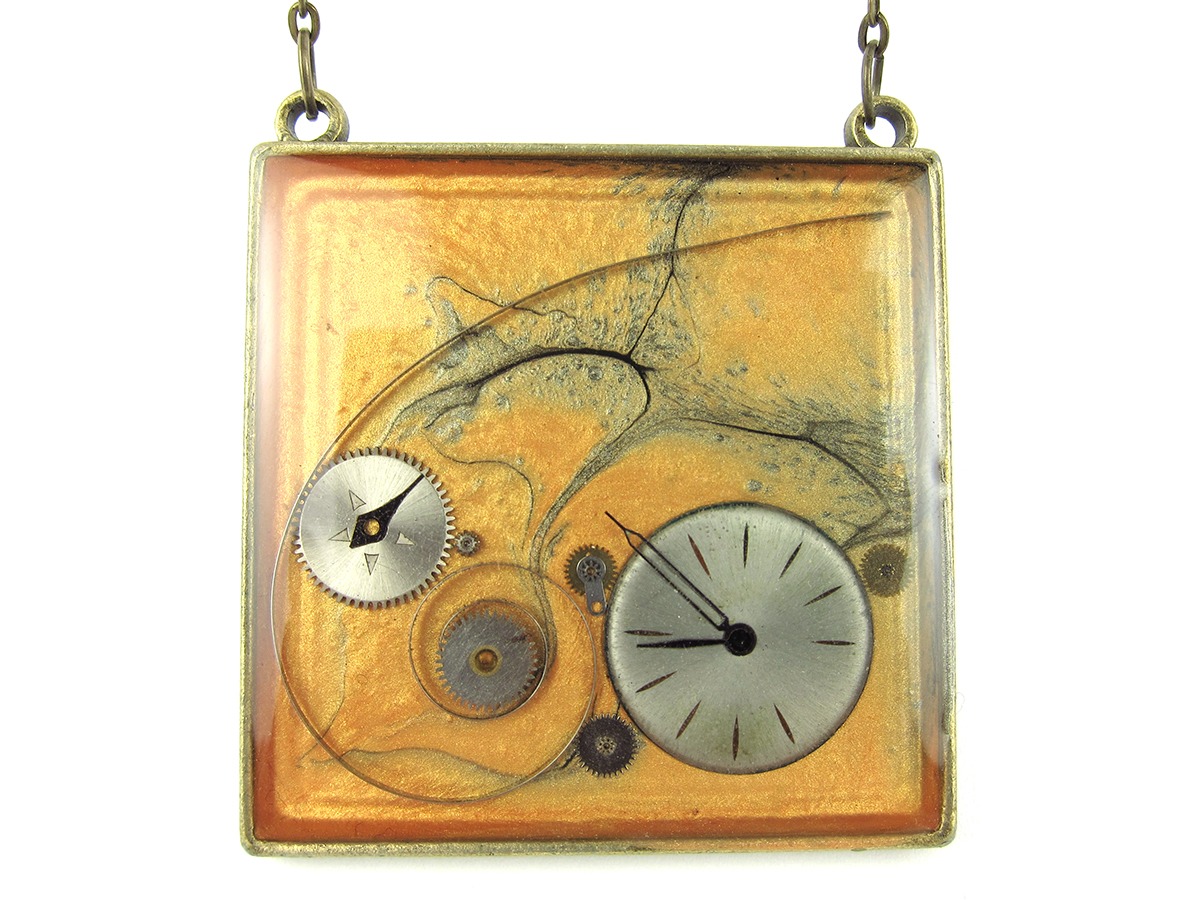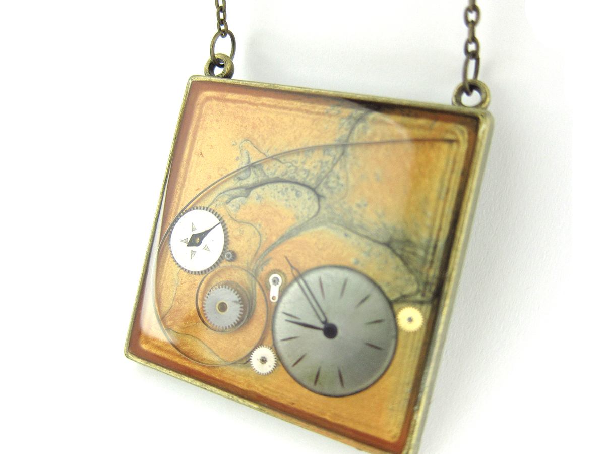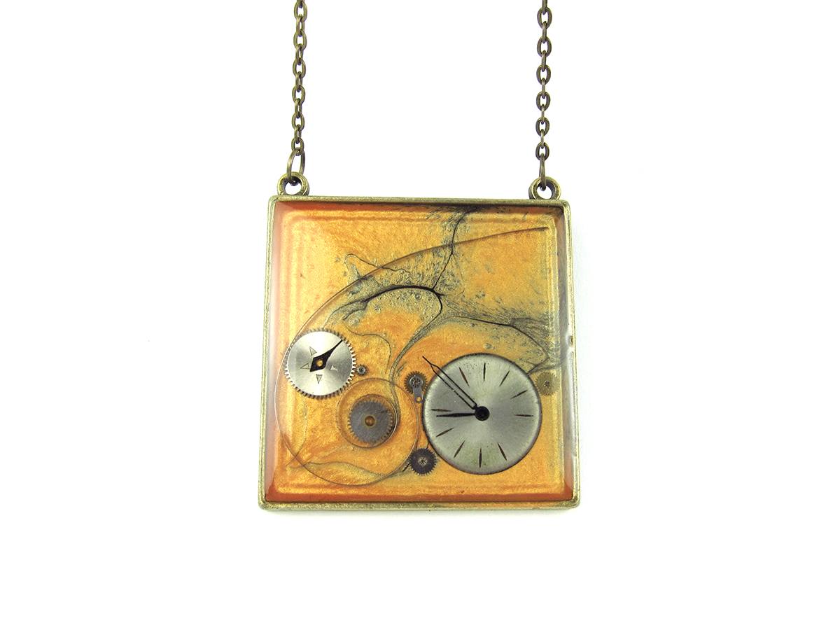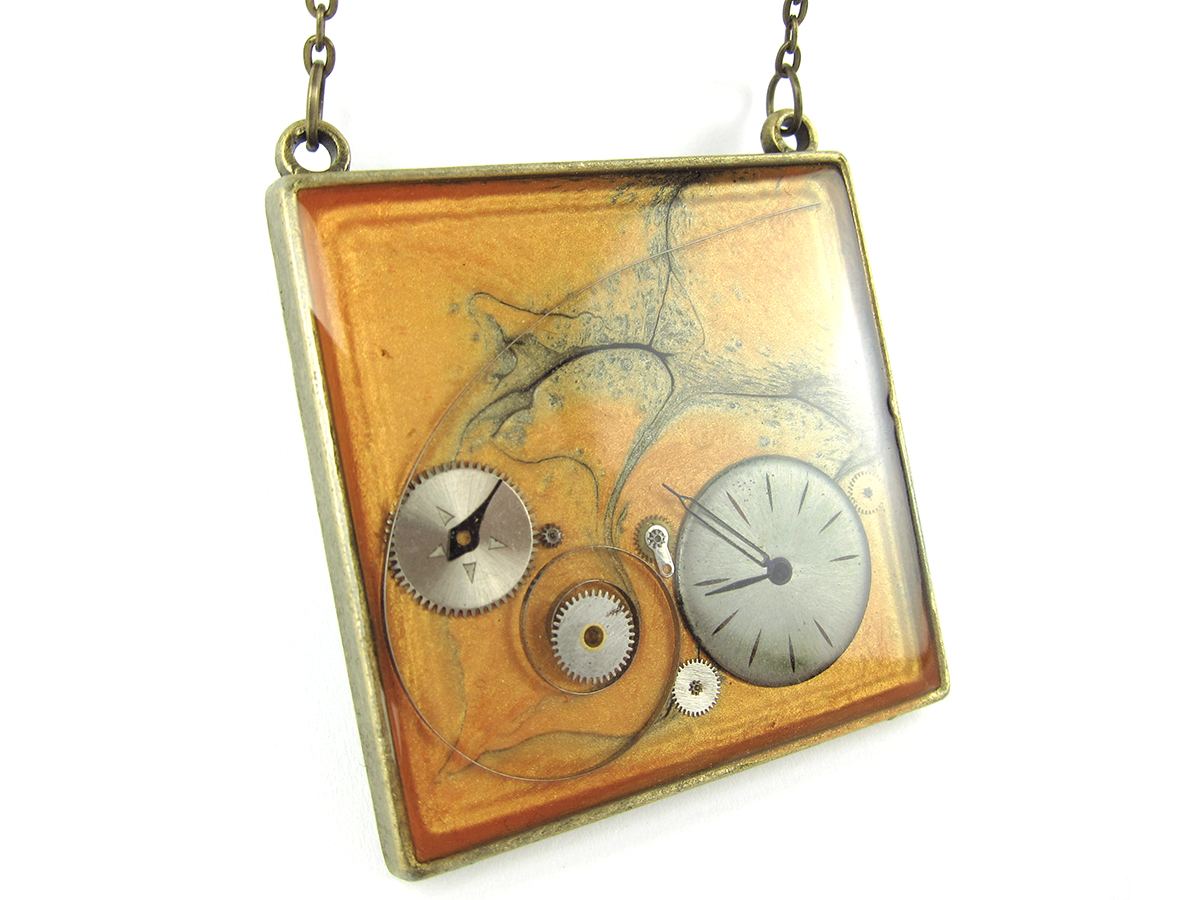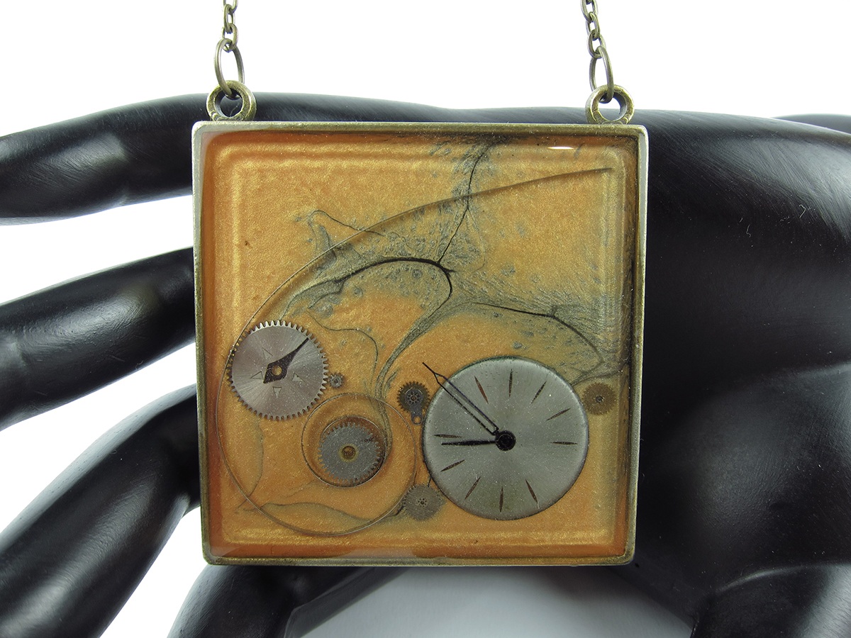 Pandantiv Steampunk realizat manual in atelierul LaCercei.ro utilizand piese din ceasuri mecanice incastrate in rasina. Materialele utilizate sunt: baza metalica, vopsea acrilica, piese de ceas si rasina epoxidica.