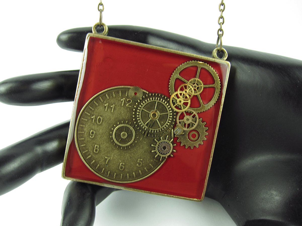 Pandantiv Steampunk realizat manual in atelierul LaCercei.ro utilizand piese din ceasuri mecanice incastrate in rasina. Materialele utilizate sunt: baza metalica, vopsea acrilica, piese de ceas si rasina epoxidica.
